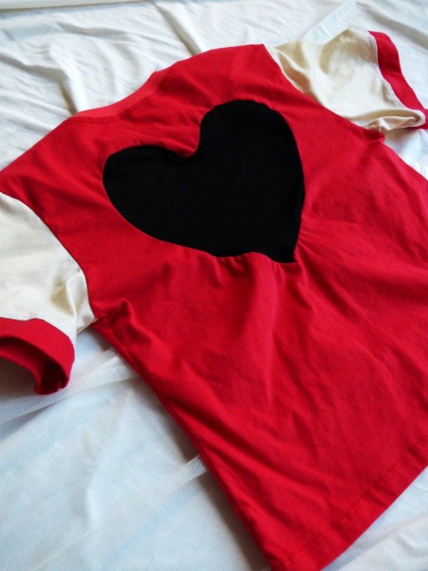 Confeccionada en jersey de algodón , esta prenda destaca por su construcción : un frente minimalista en rojo y en la espalda , donde reside el detalle estrella: un aplique central en forma de corazón con trama rayada.