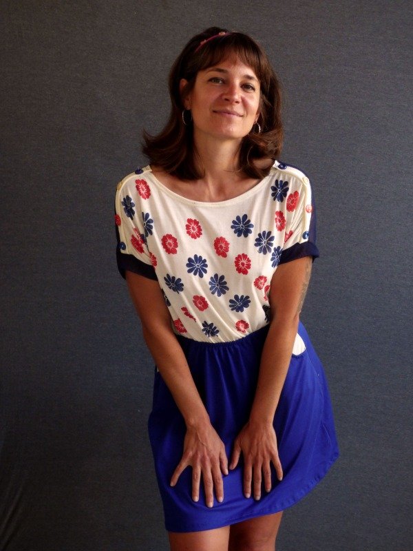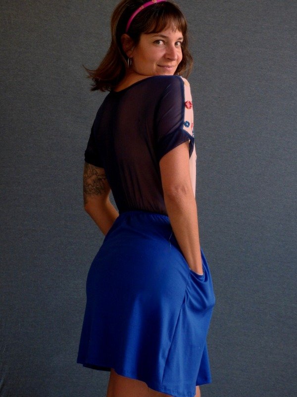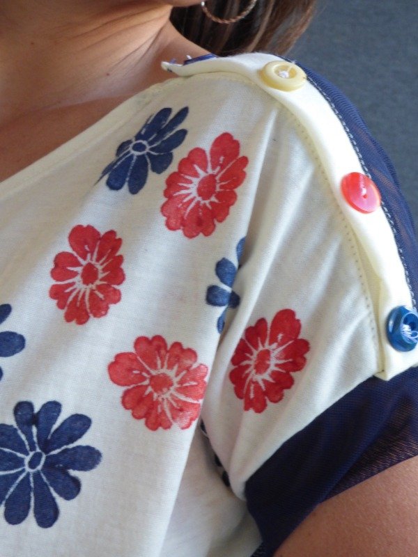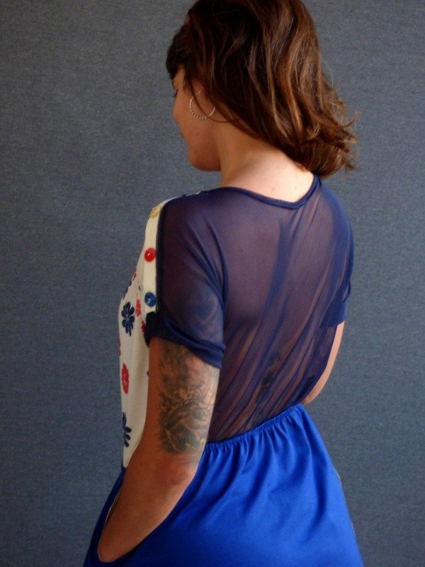 Vestido de Jersey de algodón, combinado con Tul en la espalda, lleva elástico en la cintura, un detalle de apliques con botones en el hombro y con una estampa hecha a mano por medio de sellos.