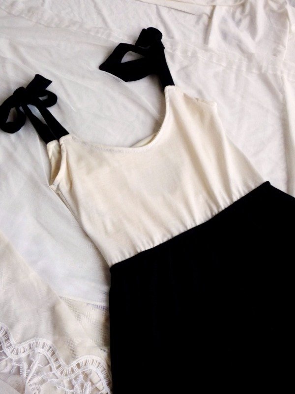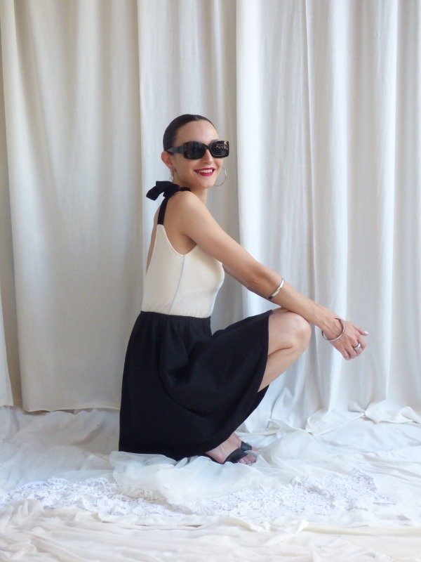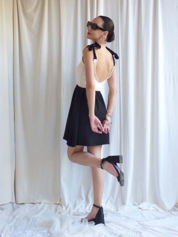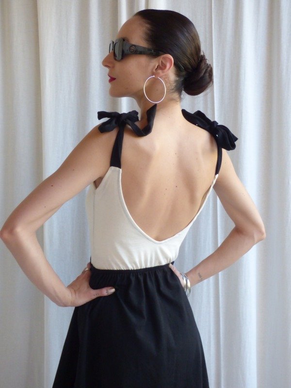 Vestido bicolor , confeccionado en jersey de algodón, cómodo y suave al tacto. La parte superior en blanco tiene escote simple con tiritas regulables. La falda negra aporta contraste y una caída fluida. Lleva elástico en la cintura, que mejora el calce y la comodidad.