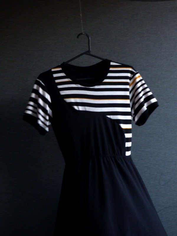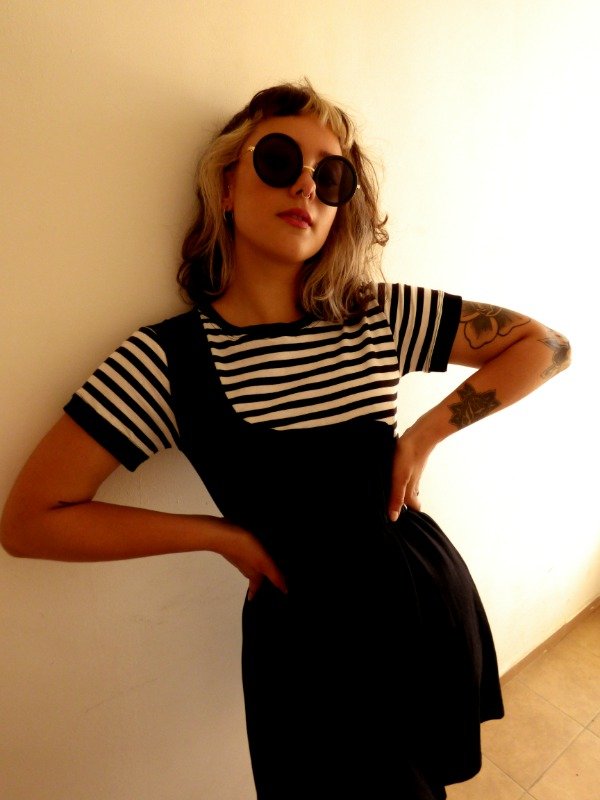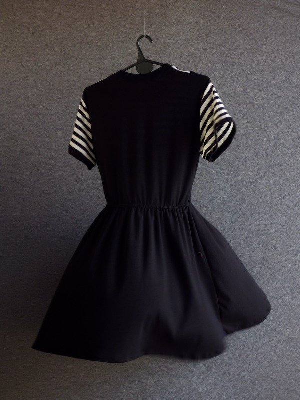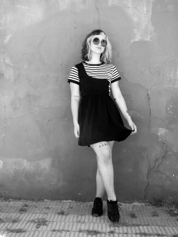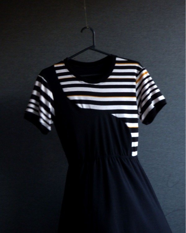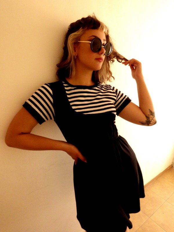 Vestido en modal suave con elástico en la cintura para un calce cómodo. Parte superior con rayas blanco y negro y falda negra con vuelo. Diseño versátil y fácil de combinar, ideal para usar todos los días.