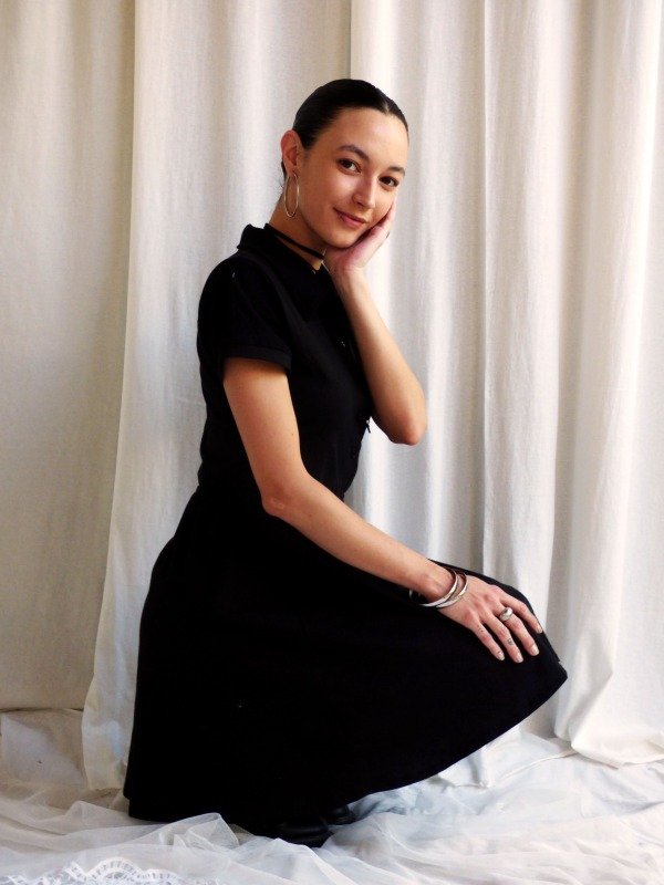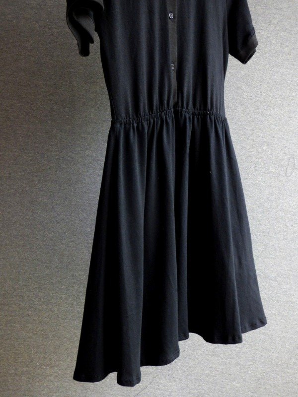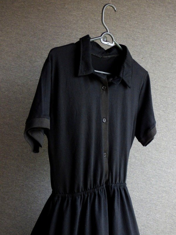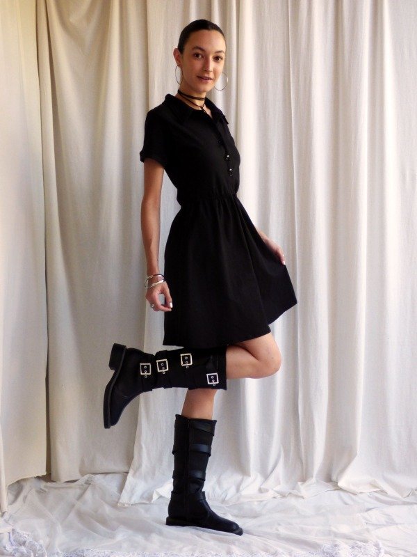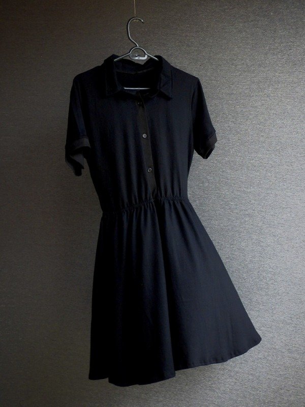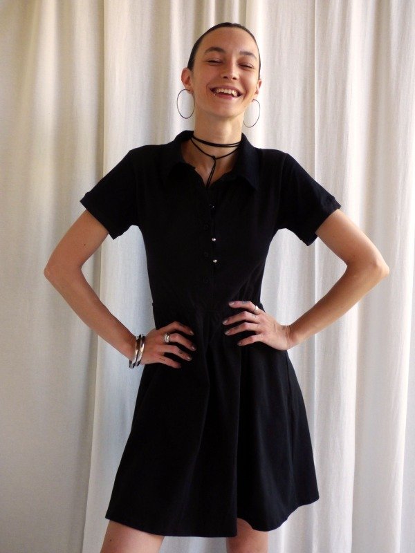 Vestido negro de corte camisero, mangas cortas y cintura elastizada que define la silueta sin ajustar.