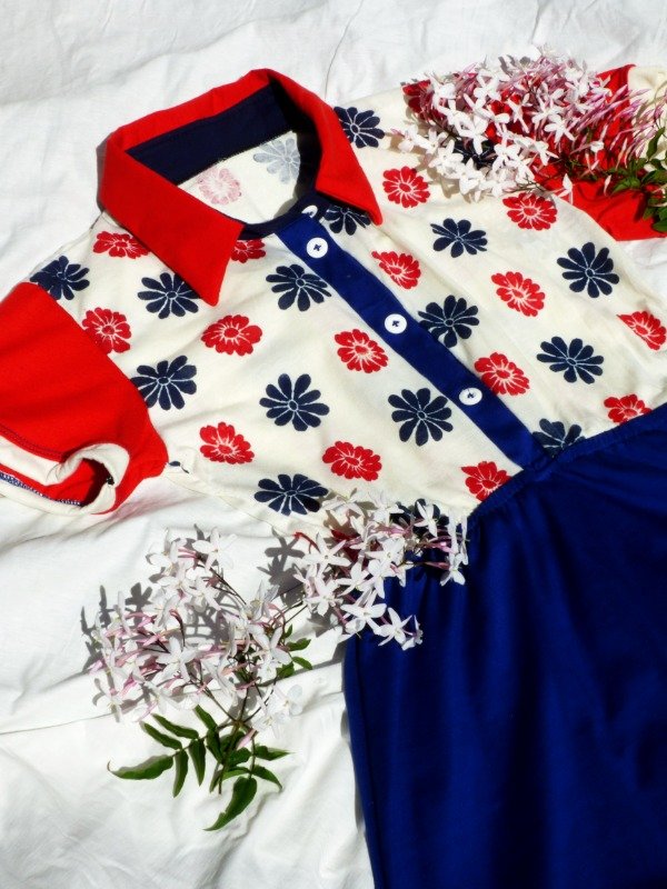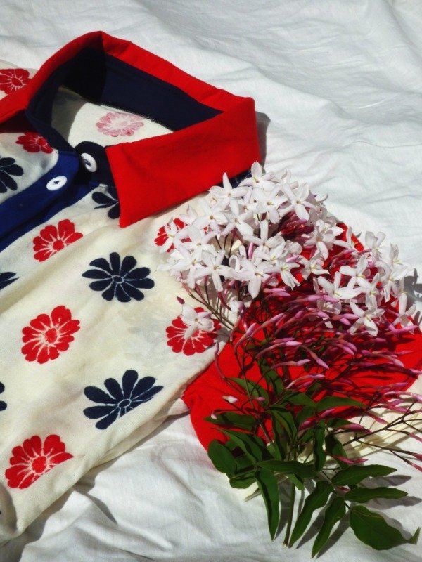 Vestido de jersey de algodón, corte retro con cuello tipo chomba y falda con cintura elástica. Estampado artesanal realizado a mano con sellos