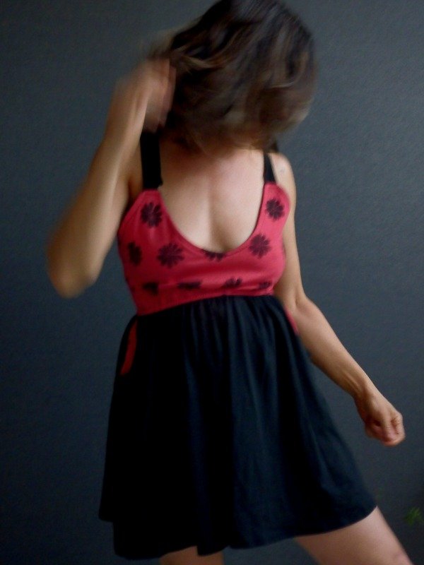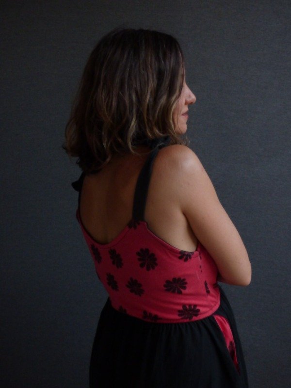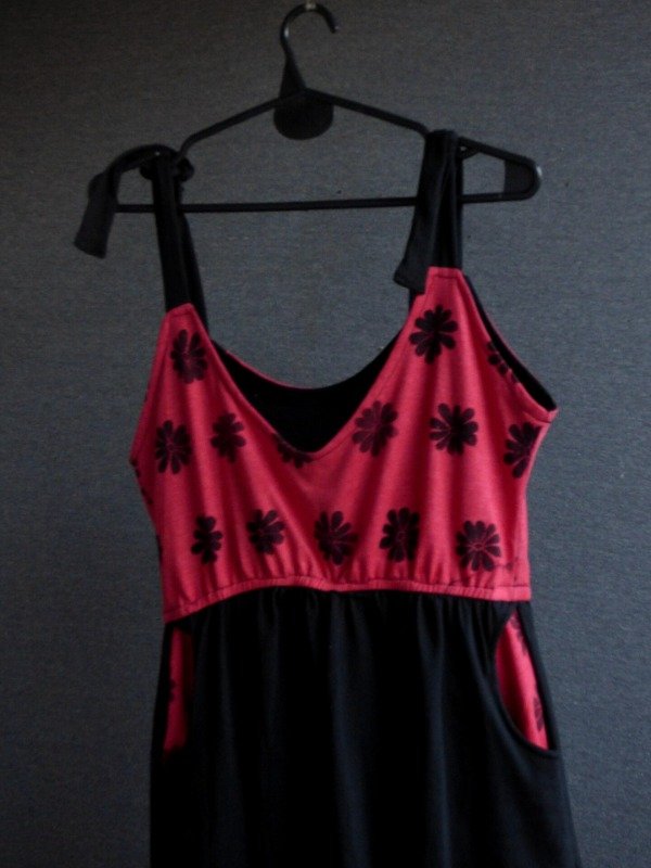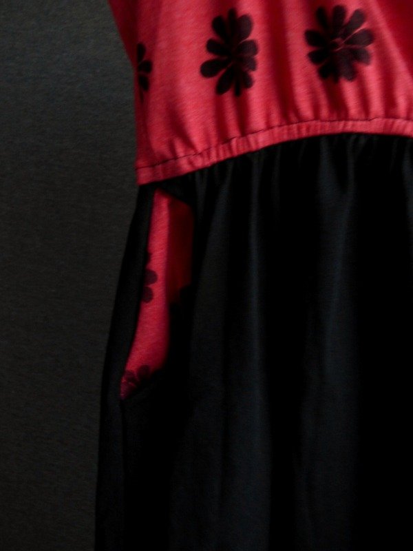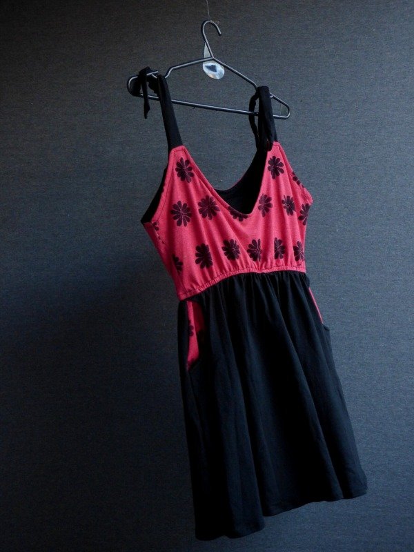 Vestido de largo midi corto, con diseño cómodo y funcional. Presenta un busto en tono rojo con estampa floral en contraste y falda en color negro.